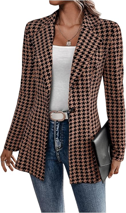 Women's Houndstooth Long Sleeve Button Blazer Jackets Trendy Open Front Casual Business Work Office Blazers