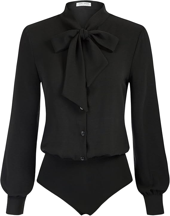 Women Bow Tie Neck Office Blouse Button Down Long Sleeve Bodysuits Blouse Top