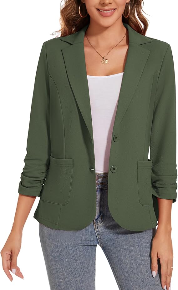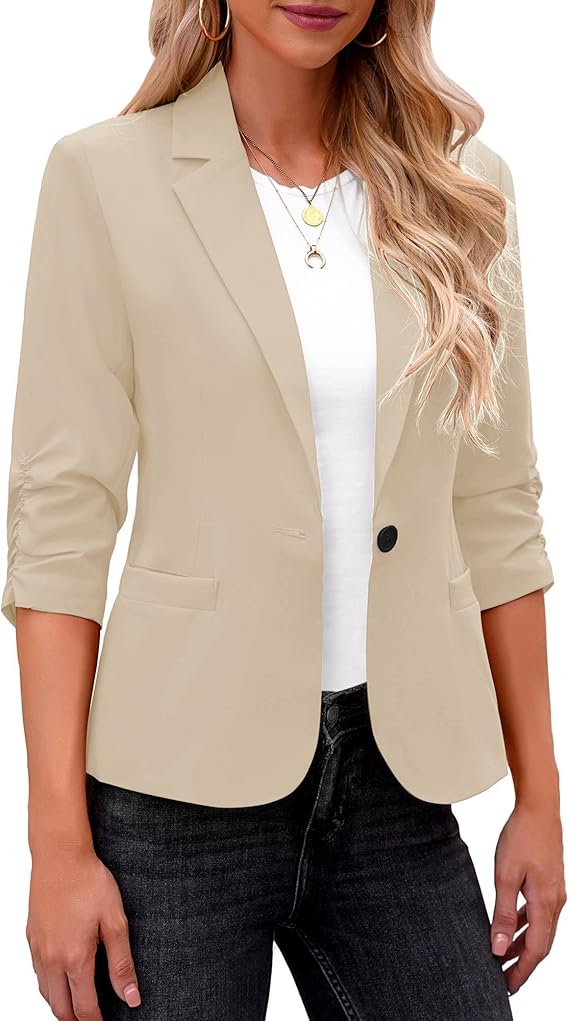 Women's 3/4 Ruched Sleeve Lightweight Work Office Blazer Jacket (S-3XL)