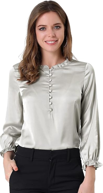 Women's Ruffle Neck Bubble Sleeve Elastic Cuff Button Work Office Satin Blouse