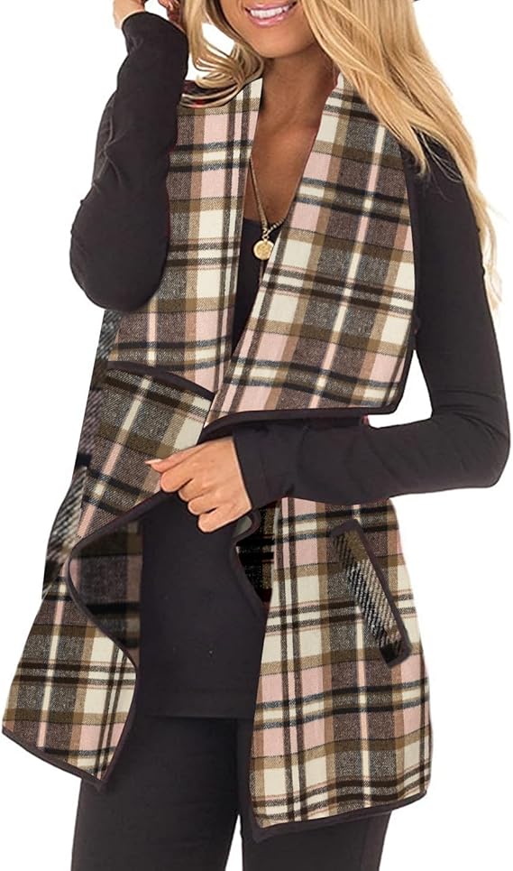 Womens Buffalo Plaid Vest Casual Lapel Open Front Sleeveless Cardigan Jacket Coat with Pockets