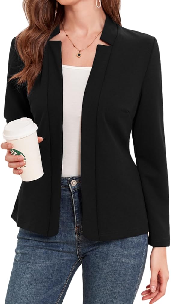 Women Open Front Blazers Long Sleeve Casual OL Office Slim Buttonless Suit Jacket with Pockets