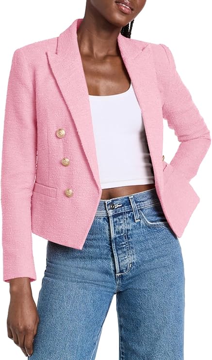 Women Double Breasted Cropped Tweed Blazer Jackets Lapel Open Front Long Sleeve Business Suit Jackets with Pocket